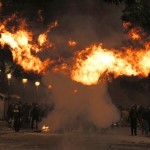 Grandes vasos partidos em cacos nas ruas, com a terra espalhada, laranjas arrancadas das árvores, caixotes de lixo derrubados, montanhas de dejetos a fumegar no meio das artérias e que se acumularam devido à greve geral cumprida na sexta-feira e no sábado, pedras, estruturas de madeira arrancadas das esplanadas, tudo serviu para os confrontos entre a polícia e os grupos de contestatários organizados, que entraram em ação quando o grosso da manifestação, com gente de todas as idades e condições, ia sendo expulsa da praça Syntagma, com o Parlamento ao fundo.
