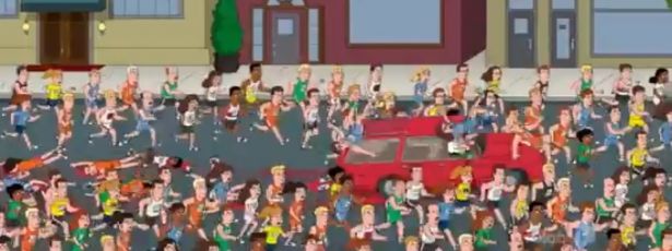 No capítulo em causa, uma das personagens, Petter Griffin, atropela indiscriminadamente os atletas da maratona de Boston, isto, ao mesmo tempo em que vence a competição ao volante de um automóvel, claro está. O mesmo boneco, no mesmo episódio desta série televisiva, trava amizade com um terrorista que planeia fazer explodir uma ponte. Pouco depois, ouvem-se explosões.