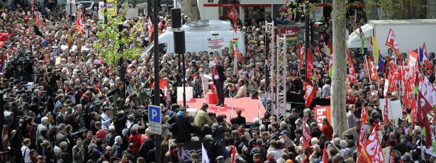 “Nós não queremos o mundo das finanças no poder! Não aceitamos a política de austeridade!”, afirmou, perante uma multidão que agitava bandeiras vermelhas dos vários movimentos de esquerda.