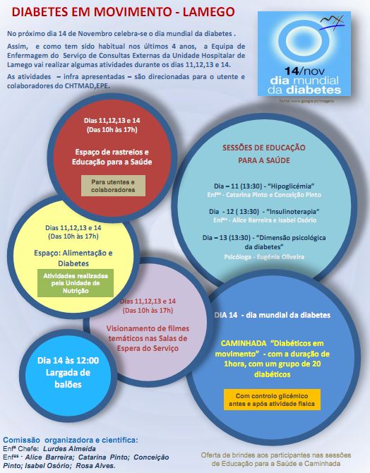 Assim sendo, e à semelhança dos anos anteriores, a equipa de Enfermagem do Serviço de Consultas Externas da Unidade Hospitalar de Lamego pretende também, este ano, desenvolver atividades de caráter educativo e formativo bem como dinâmicas de interação com utentes diabéticos e colaboradores do CHTMAD E.P.E.
