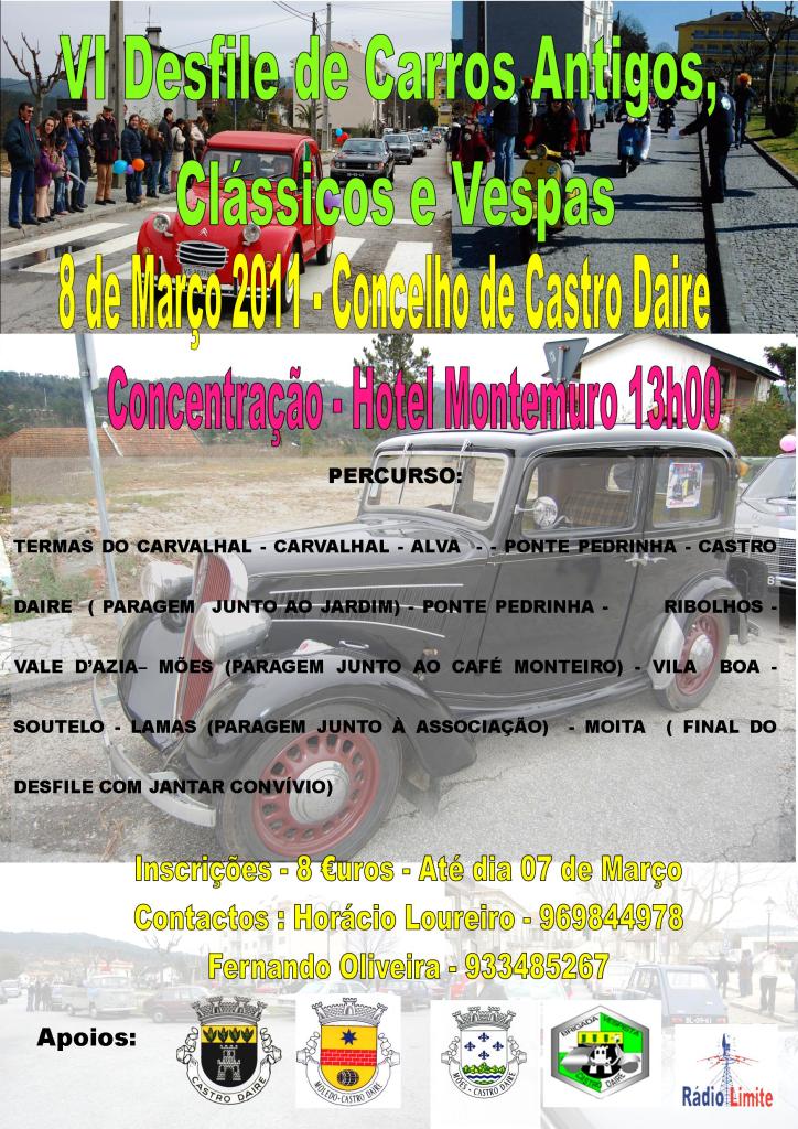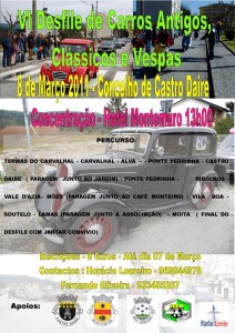 O Concelho de Castro Daire vai receber, no próximo dia 8 de Março, dia de Carnaval, o VI Convívio de Desfile de Carros Antigos, Clássicos e Vespas de Castro Daire.