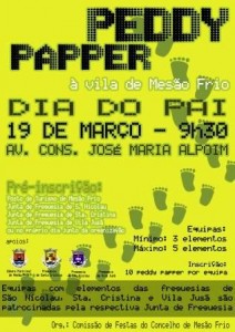 A Comissão das Festas Concelhias de Mesão Frio promove um Peddy Papper que percorrerá a Vila de Mesão Frio de lés-a-lés. Esta iniciativa é dirigida a Pais e Filhos, e a todos aqueles que desejem participar, mesmo não sendo do Concelho. De carácter lúdico e de cultura geral sobre a história da Vila, o Peddy Papper inquirirá os participantes sobre a história de Mesão Frio e das instituições do Concelho, terminando com um almoço para todos os participantes. As inscrições poderão ser realizadas no próprio dia, na Avenida Conselheiro José Maria Alpoím, ou nas Juntas de Freguesia de São Nicolau, Santa Cristina e Vila Jusã, sendo que os participantes oriundos destas freguesias são patrocinados pelas mesmas.